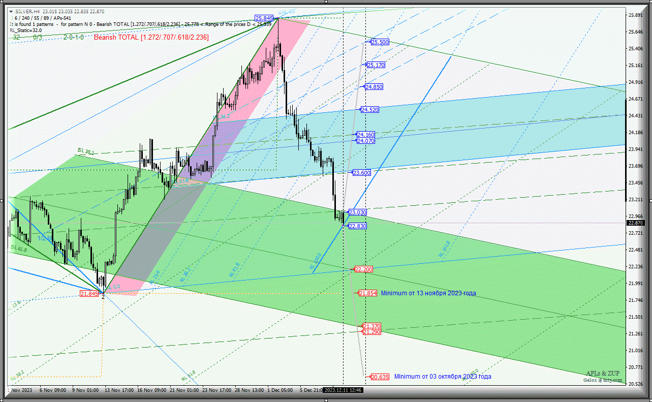 Развитие движения Spot Silver-h4 с 12 декабря 2023 года продолжится в зоне равновесия (23.030 - 22.200 - 21.370) вил старшего операционного масштаба Minute-h4 с учетом направления пробоя диапазона: